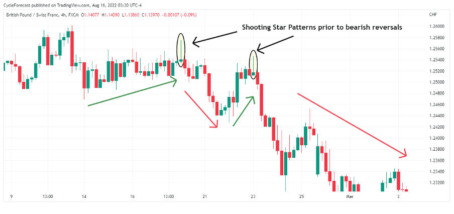 उल्टे हथौड़े वाली कैंडल के बाद आपको एक बुलिश ट्रेंड की ज़रूरत होती है; अन्यथा, यह ट्रेडिंग के योग्य का कैंडलस्टिक पैटर्न नहीं होगा। यदि आपके पास एक नहीं है तो शूटिंग स्टार ट्रेडिंग विफल हो जाएगी। असल में, शूटिंग स्टार कैंडल की पुष्टि कैंडल के लो के टूटने पर निर्भर करती है। हालाँकि, नुकसान के जोखिम को कम करने के लिए आपको हमेशा अन्य स्रोतों से इसकी पुष्टि करनी चाहिए। यदि आप एक आक्रामक ट्रेडर हैं तो शूटिंग स्टार चार्ट पैटर्न से दूर रहना सबसे अच्छा है।