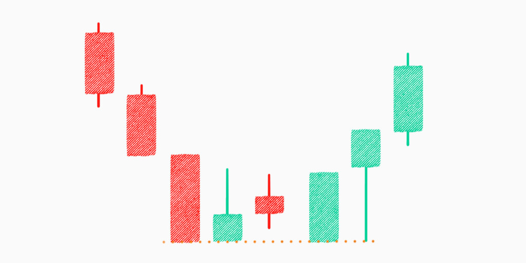 मान लें कि आप एक स्टॉक का ट्रेड कर रहे हैं, और कीमत कम हो जाती है और नियर-टर्म लो के निचले स्तर से नीचे टूट जाती है। हालांकि, यह एक अनिर्णित कैंडल के साथ आगामी बुलिश के दबाव का पहला संकेत दिखाता है, इसके बाद एक बुलिश का हैमर।