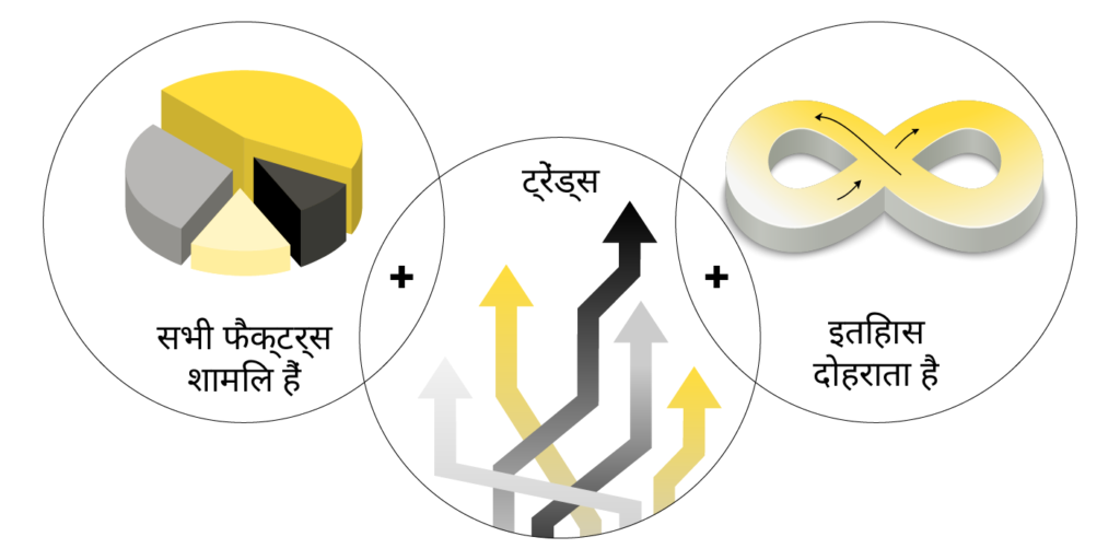 - मूल्य आंदोलन का इतिहास हमेशा खुद को दोहराता है। जैसा कि मुख्य व्यापारिक सिद्धांत कहते हैं, “जो एक बार हुआ वह फिर से होगा,” इस प्रकार कीमतों में उतार-चढ़ाव प्रकृति में चक्रीय होते हैं और बार-बार दोहराए जाते हैं। यह मुख्य कारण है कि 10-, 50- और 100-वर्षीय रुझान अभी भी काम करते हैं (जैसे “डब्ल्यू” ट्रेंड रिवर्सल पैटर्न)।