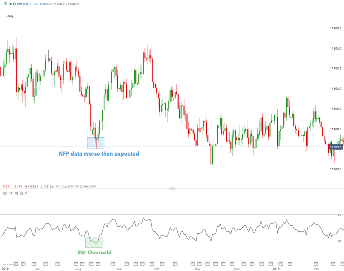 Pada gambar di atas, Anda dapat melihat contoh penggunaan indikator RSI (alat teknis) yang dikombinasikan dengan rilis data non-farm payroll, yang merupakan indikator fundamental penting di AS.
