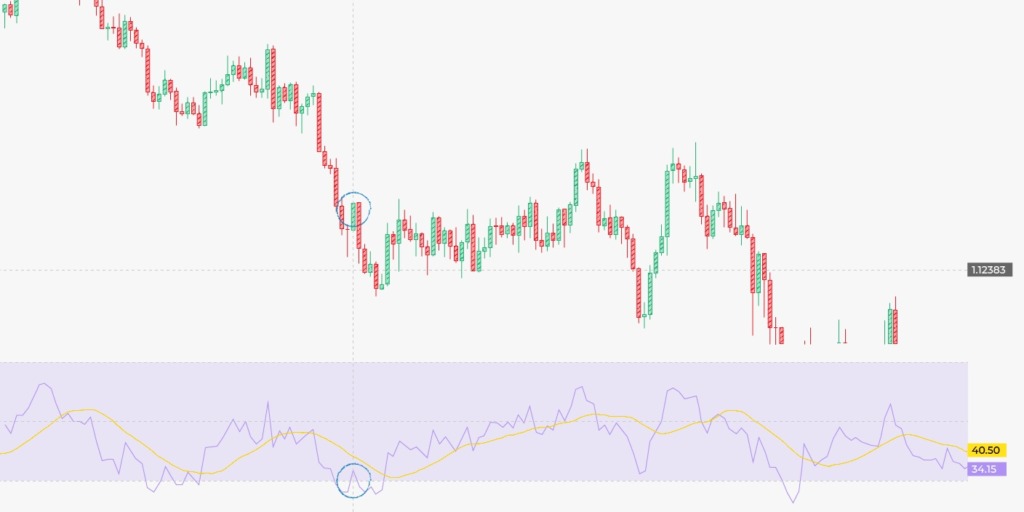 Por exemplo, a regra do indicador RSI diz para comprar quando o índice sai da zona de sobrevenda (nível 30). Parece simples. No entanto, se você observar o gráfico abaixo, verá que o índice saiu da zona de sobrevenda, mas retornou a ela no dia seguinte. Assim, a queda continuou por mais quatro dias.