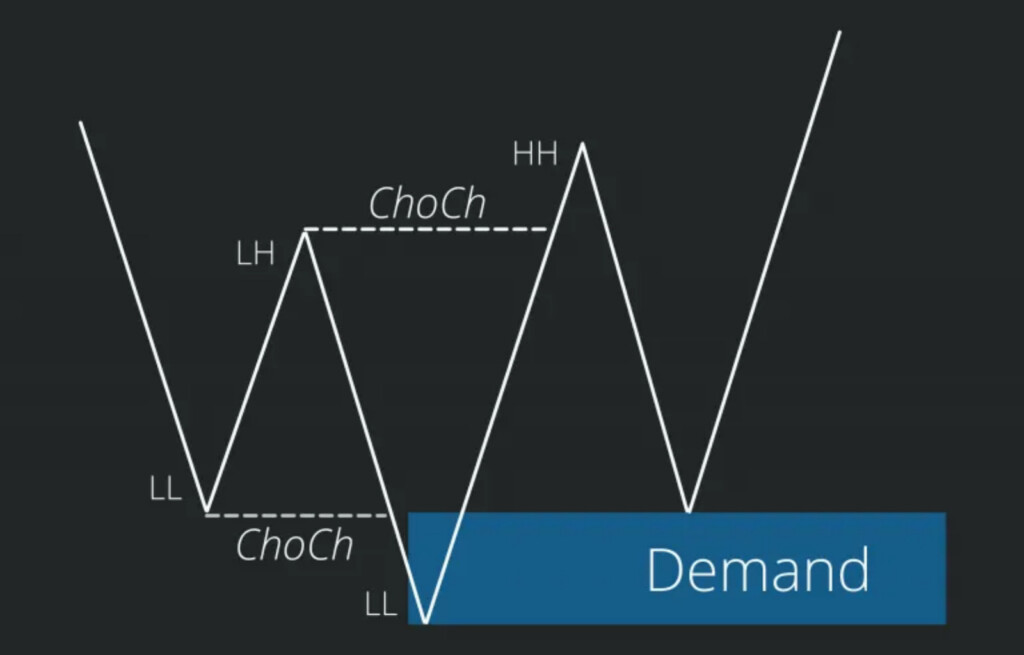 Pelo contrário, quando uma nova alta é formada, seguida por uma tendência de baixa impulsiva, o sinal aponta para o fato de que a tendência de alta pode estar terminando. Isso mostra que a transição Choch ocorreu.