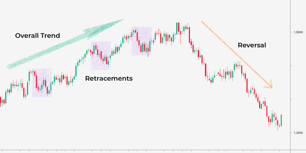 É vital distinguir entre uma retração de preço e uma reversão de tendência. Uma retração é um movimento de preço de curto prazo contra a tendência atual, mas com um retorno subsequente a ela. As retrações ocorrem em todas as tendências de alta, baixa ou lateral.