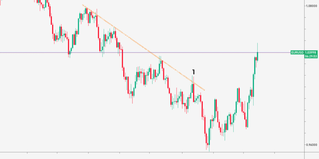 Observe o gráfico acima. O preço está se movendo dentro de uma tendência de baixa. Uma linha de tendência (linha laranja) serve como um nível de resistência. O preço tocou este nível três vezes antes da quarta retração ocorrer (1). Você pode abrir uma negociação de venda nesse ponto. Além disso, você pode implementar uma ordem de take-profit móvel para movê-la dependendo das condições do mercado. Um nível de stop-loss deve ser calculado considerando o tamanho do ponto de take-profit.