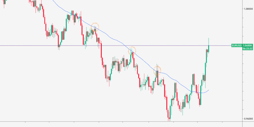 Um indicador de média móvel (MA) também serve como um nível de suporte/resistência. Se um preço se move em uma tendência, você sempre pode adicionar uma média móvel simples para identificar o fim de uma retração. O período de uma média móvel dependerá do período de tempo que você usar.