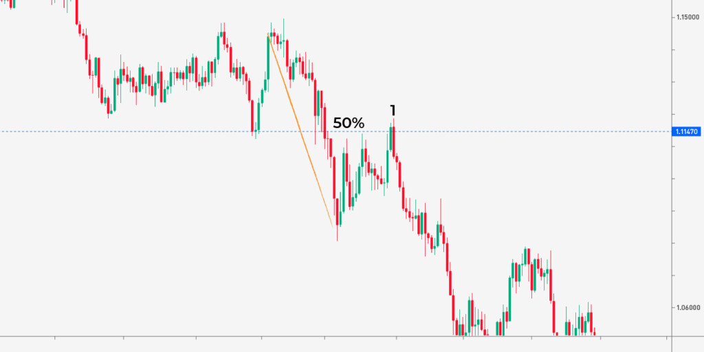 O gráfico acima reflete tal situação. O preço atingiu 50% de seu movimento anterior (1) e continuou se movendo em tendência de baixa. Você pode abrir uma negociação de venda assim que o preço formar uma vela de baixa após atingir o ponto de 50%. Os níveis de take-profit e stop-loss dependeriam das condições do mercado.