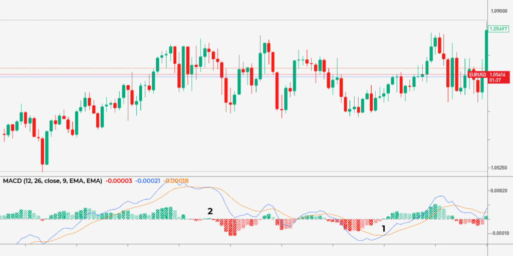 - Cruzamento de linha 0: O MACD consiste em um histograma e duas linhas – MACD e uma linha de sinal. Quando o histograma sobe acima de 0, é sinal de que o preço vai subir (1). Por outro lado, quando o histograma cai abaixo de 0, espera-se que o preço caia (2). Como o scalping é feito em intervalos curtos, os traders entram no mercado assim que ocorre uma quebra, não quando o histograma está acima ou abaixo de 0.