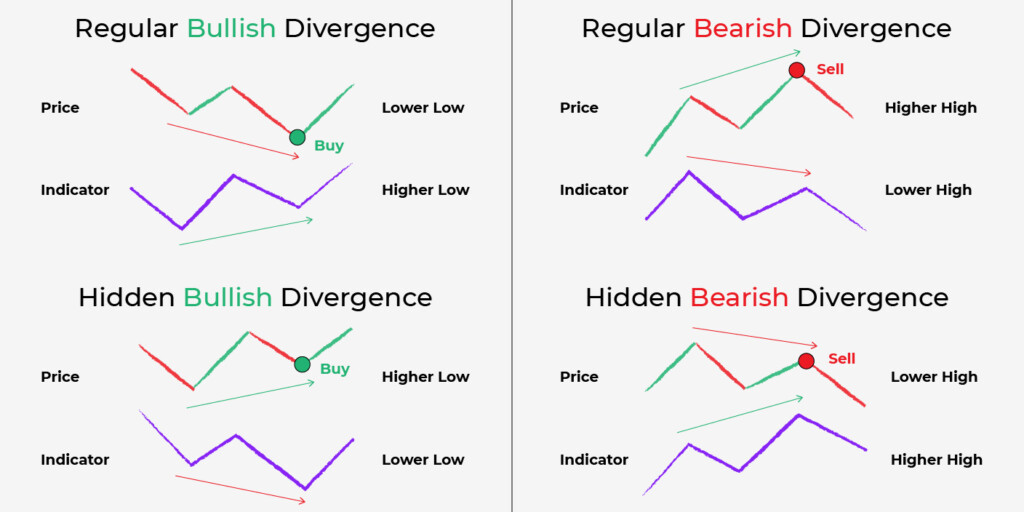 - Convergência/divergência: A convergência/divergência é outro sinal popular usado pelos cambistas (scalpers). Aparece quando o preço e o MACD se movem em direções diferentes – quando o preço sobe, o MACD desce e vice-versa. Os quatro sinais são mostrados na figura abaixo.