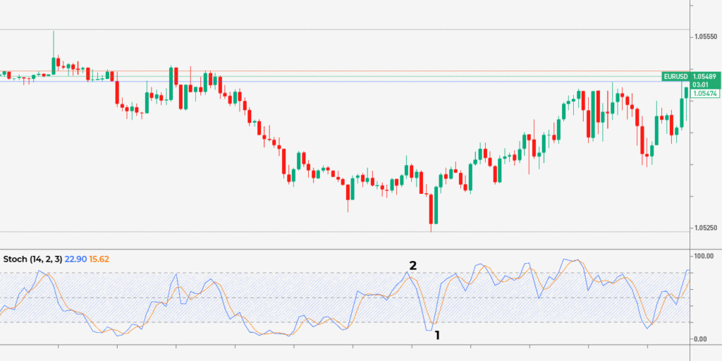 Quanto ao indicador RSI, as condições de sobrecompra/sobrevenda não fornecem sinais confiáveis para scalpers. Portanto, eles usam alertas de divergência e cruzamentos %K e %D: quando %K sobe acima de %D, espera-se que o preço suba (1); quando %K cai abaixo de %D, espera-se que o preço caia (2).
