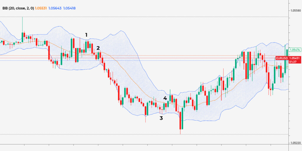 Para captar sinais de compra/venda, você precisa observar a localização do preço em relação às bandas e à linha intermediária. Quando o preço toca a banda superior, é sinal de que cairá em breve (1). Se quebrar abaixo da linha do meio, é sinal de que a queda vai continuar (2). Por outro lado, quando o preço tocar a banda inferior, provavelmente subirá em breve (3). Uma quebra acima da linha do meio sinaliza a continuação da subida (4). Você pode abrir várias negociações ou usar uma ordem de take-profit (realizar lucro).