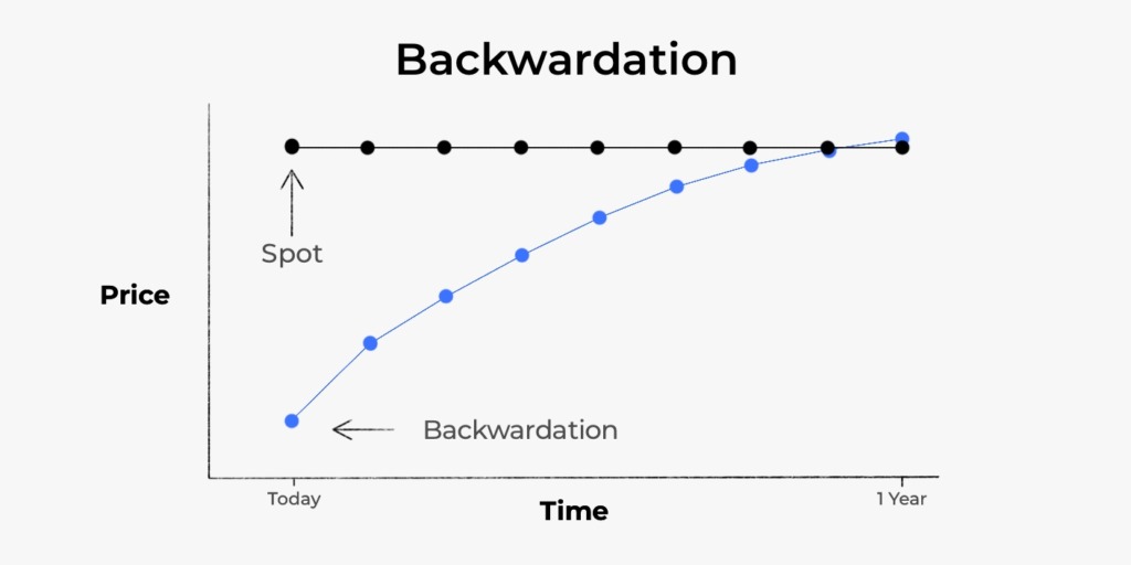 Quando o preço à vista de uma mercadoria ou ativo se torna maior que o preço futuro, diz-se que essa mercadoria ou ativo está em Backwardation. Isto muitas vezes ocorre devido à escassez de commodities no mercado.