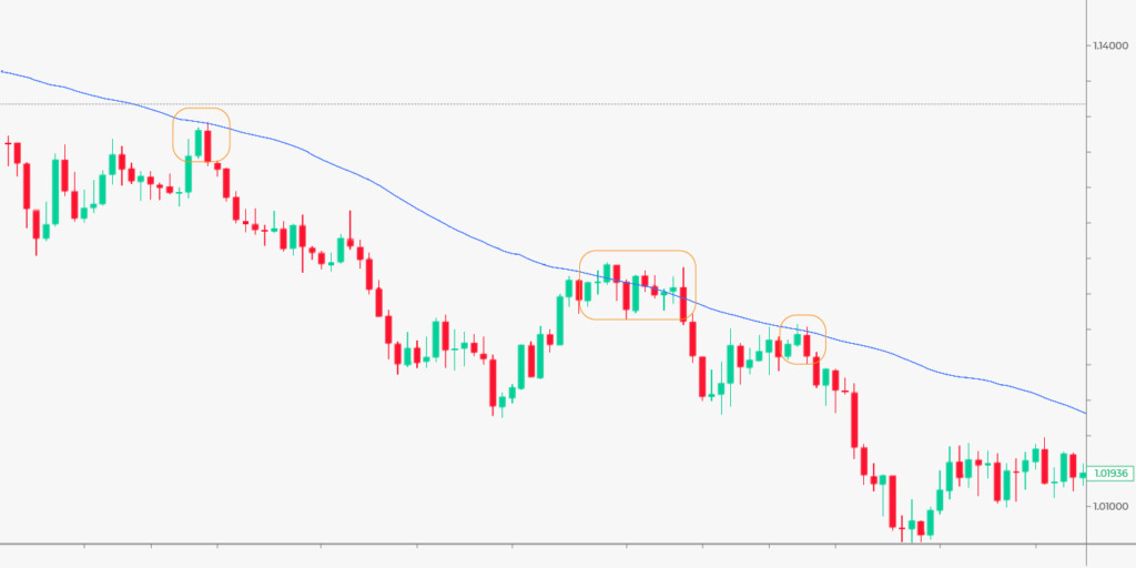 Você pode usar o MA como níveis de suporte e resistência. No entanto, esse sinal funcionará melhor em prazos de curto prazo. Em gráficos mais altos, o MA se afasta do preço para servir como um limite.