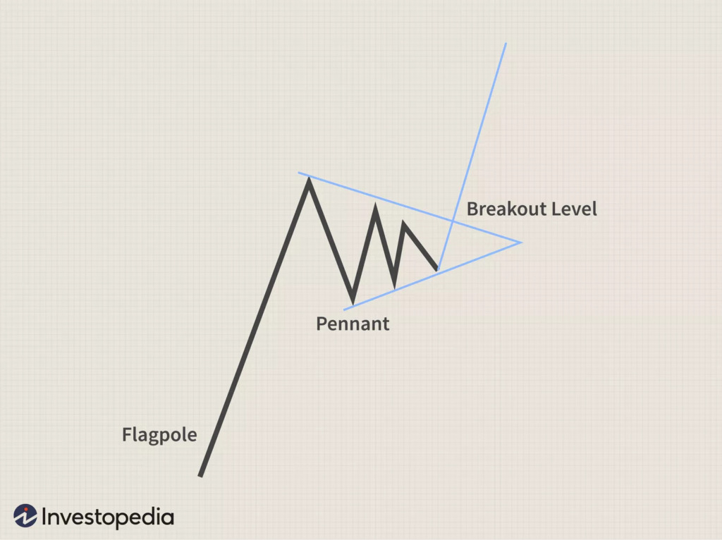O mastro de bandeira no gráfico acima mostra a tendência ascendente anterior, o padrão de flâmula formado pela fase de consolidação, e o foco dos traders está no possível rompimento da linha de tendência superior do triângulo simétrico.