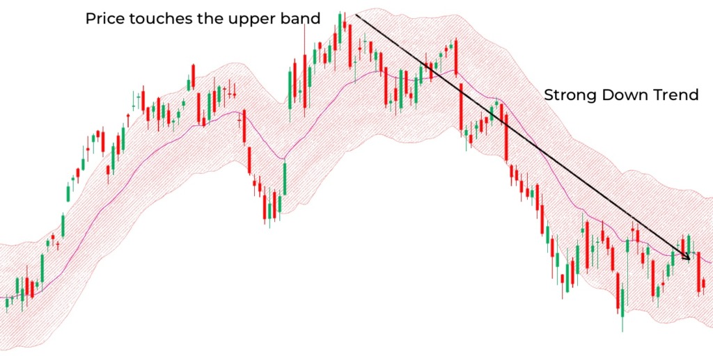 Você pode ver na figura abaixo que uma forte indicação de uma tendência de baixa é dada quando o preço atinge a banda superior e a linha superior também aponta para cima.