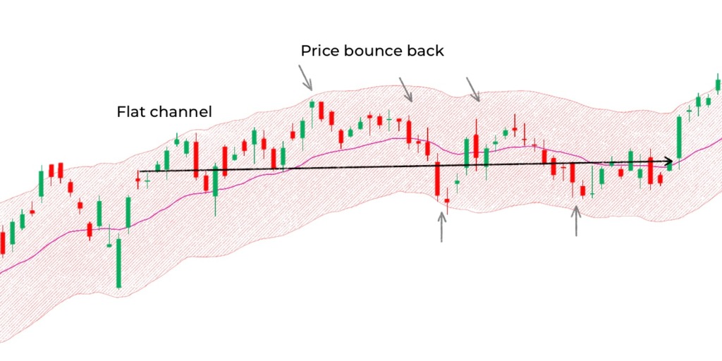 Há fortes perspectivas de reversão de tendência quando o preço fecha perto da borda do canal inferior ou superior. Uma dica de que o preço sairá em breve é indicada quando o Keltner Channel avança em uma direção plana.