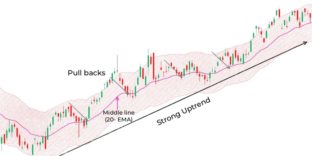 Você pode observar no gráfico abaixo que o preço parece flutuar próximo à linha média (20-EMA) quando há uma tendência de alta significativa.