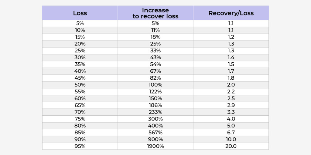 Esta tabela mostra quanto uma negociação deve render para cobrir todas as negociações perdedoras anteriores. Por exemplo, será necessário fazer retornos de 54% do saldo atual para recuperar um depósito depois de perder 35% do valor inicial.
