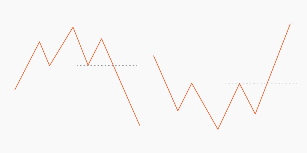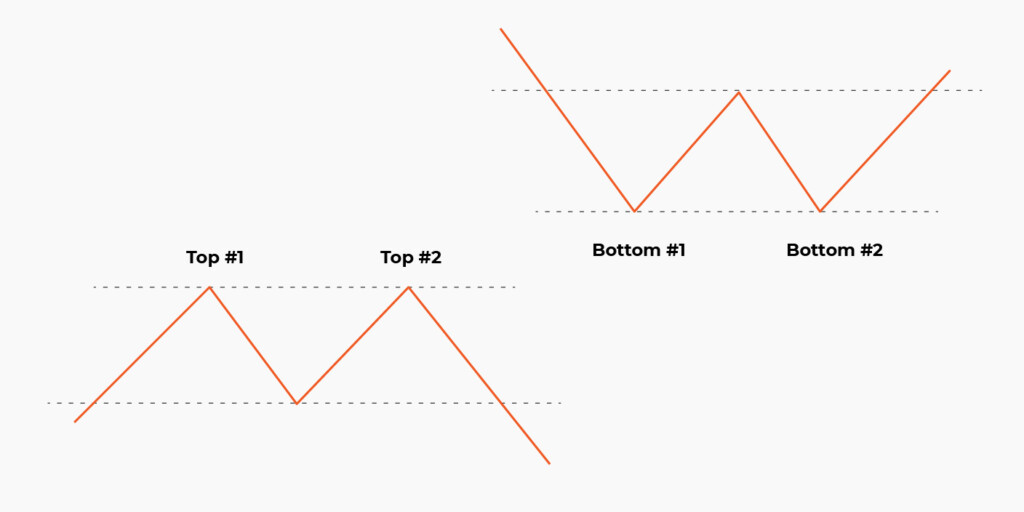 O padrão de mínimo duplo é sua contraparte de alta, com duas mínimas consecutivas separadas por um pico. Quando o preço sobe acima da linha de pescoço traçada pelas máximas, isso sinaliza que uma reversão de alta auspiciosa pode estar no horizonte.