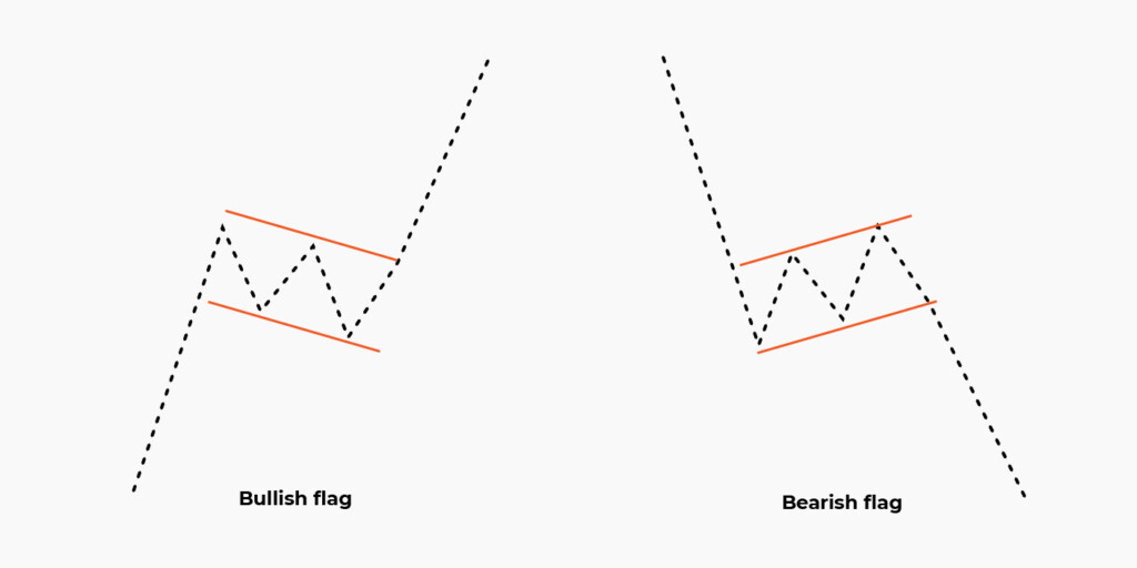 O padrão de bandeira de alta começa com um movimento de preço ascendente acentuado, semelhante a um mastro de bandeira. Posteriormente, há um período temporário de consolidação em que o preço forma um padrão retangular ou em forma de flâmula, conhecido como bandeira. Essa consolidação indica uma pausa momentânea antes que a tendência de alta seja retomada.