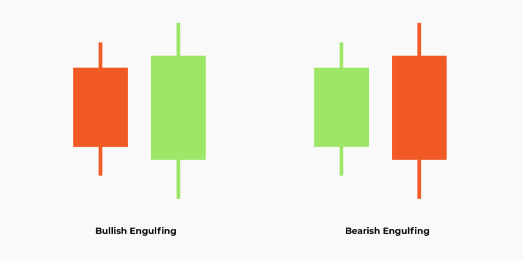 No padrão engolfo de alta, a primeira vela é vermelha (preta), enquanto a segunda é verde (branca) e envolve completamente a vela anterior. Tal formação aponta para uma reversão potencial de uma tendência de baixa para uma tendência de alta.