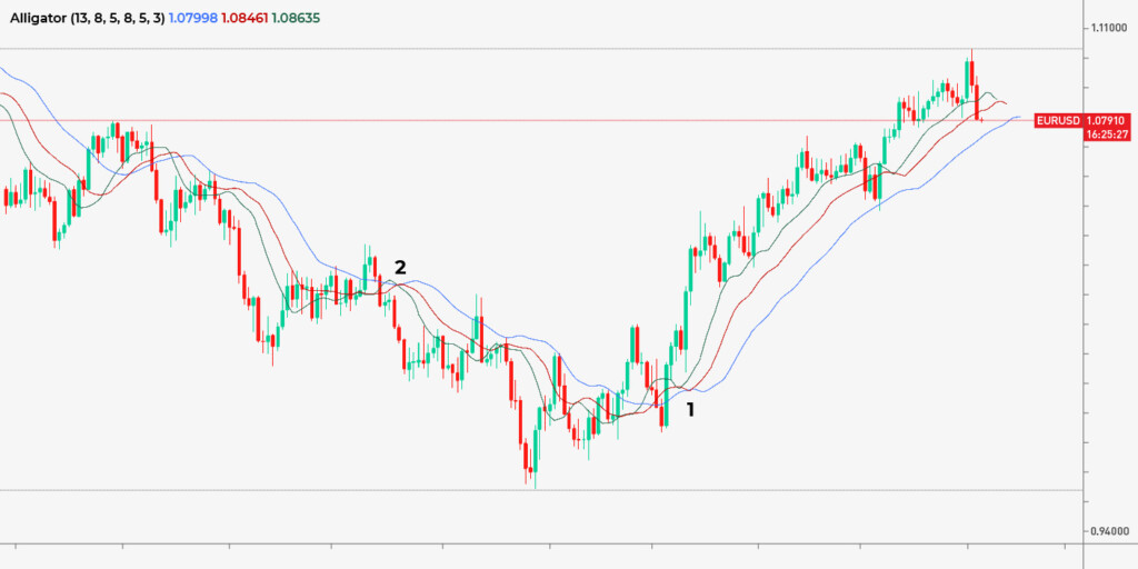 Uma vez que o SMMA mais rápido rompe acima de outras médias móveis, isso é um sinal de compra (1), pois o Alligator diz ao trader que o preço se moverá em uma tendência de alta. Uma vez que o SMMA mais rápido cai abaixo de outras médias móveis, isso é um sinal de venda (2), pois o indicador informa ao trader que o preço se moverá em uma tendência de baixa.