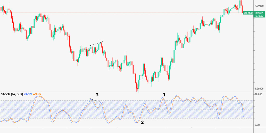 Um oscilador estocástico é um indicador de momento que mede a força do preço. Ele consiste em duas linhas que se movem dentro do intervalo 0-100.
