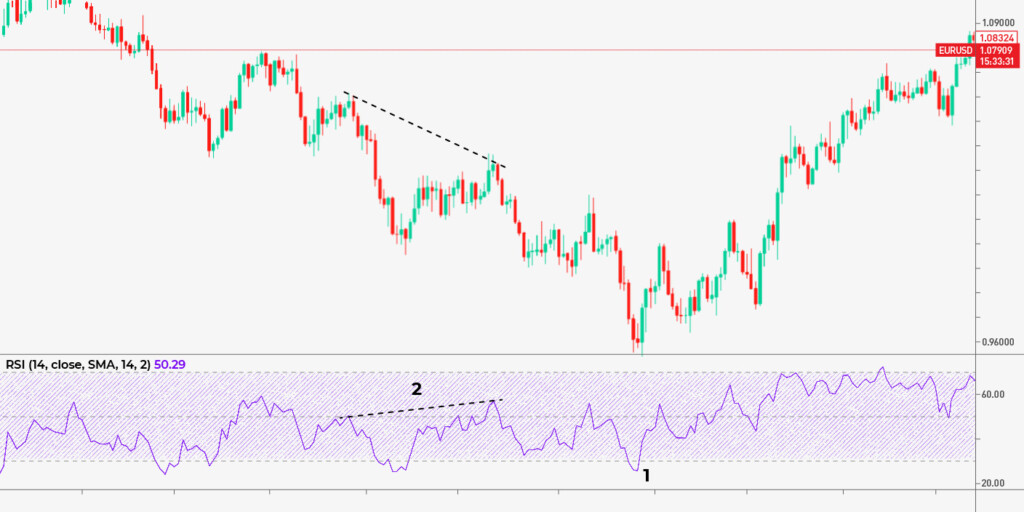O RSI consiste em uma única linha que se move dentro de um intervalo de 0-100. Seus principais sinais são: