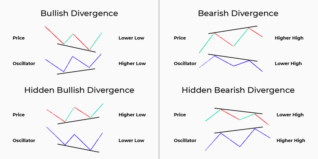 As divergências ocultas fornecem sinais mais fracos, mas podem ser usadas se confirmadas por outros indicadores ou padrões.