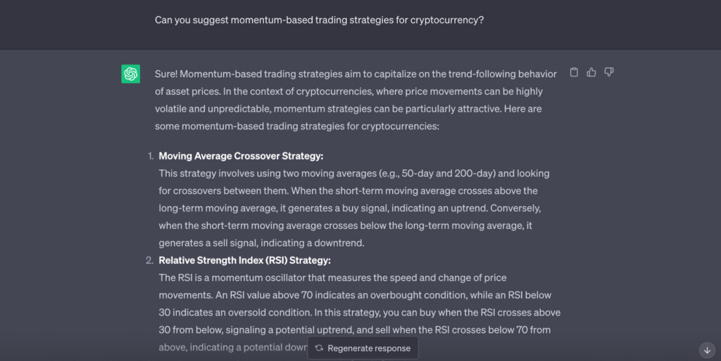 - İyi istek: Kripto para birimi için momentuma dayalı işlem stratejileri önerebilir misin?